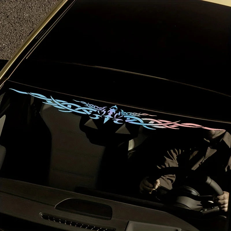 Ce bandeau pare-brise arbore des ailes tribales symétriques, angulaires et dynamiques, qui appuient une esthétique agressive. Parfait pour ceux qui veulent que leur voiture parle avant qu’elle roule.